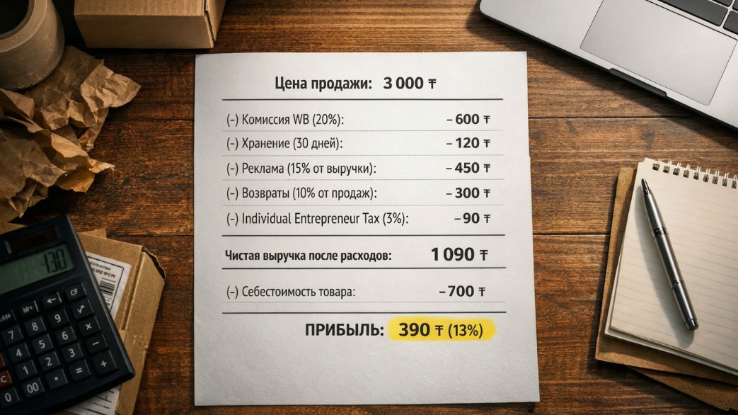Пример расчёта — товар 3 000 ₸, FBO, Wildberries