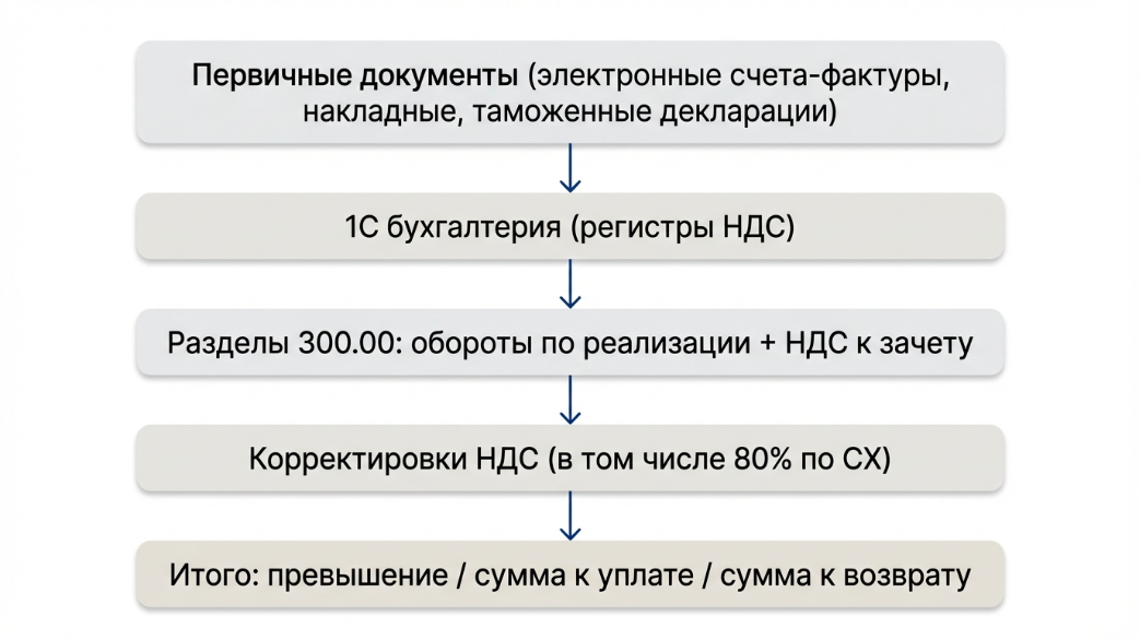 - Только после этого — перегенерировать форму 300.00 из 1С⚠️ Важно: не давать «магических» исправлений вручную прямо в декларации, если программа позволяет. Это создаёт «ручное» расхождение, которое сложнее отследить и объяснить при проверке.